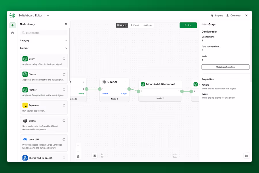 It allows you to connect all the latest voice and audio tools (both open source and proprietary) into unique combinations and instantly test them in the browser. These can subsequently be deployed on any platform using the Switchboard SDK.